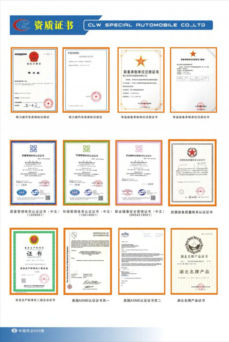 公司(si)(si)(si)是湖(hu)北(bei)省人(ren)民(min)政(zheng)府認(ren)定全省汽(qi)車及零部(bu)件出(chu)口基地,湖(hu)北(bei)省特種(zhong)車輛改裝應急(ji)保(bao)障(zhang)動(dong)(dong)員(yuan)中(zhong)(zhong)心(xin),是國(guo)(guo)(guo)(guo)家(jia)經濟動(dong)(dong)員(yuan)辦公室、總后勤部(bu)軍需物資(zi)油料部(bu)認(ren)定的軍用(yong)(yong)物資(zi)采(cai)購動(dong)(dong)員(yuan)供應商,國(guo)(guo)(guo)(guo)家(jia)高新技(ji)(ji)術(shu)企(qi)業(ye)(ye)。公司(si)(si)(si)現有(you)總資(zi)產(chan)(chan)20億元(yuan),占地2000余(yu)面,員(yuan)工8000余(yu)人(ren),其中(zhong)(zhong)技(ji)(ji)術(shu)類人(ren)員(yuan)500多(duo)(duo)(duo)人(ren),技(ji)(ji)術(shu)工人(ren)2000余(yu)名,年(nian)生(sheng)(sheng)產(chan)(chan)專(zhuan)用(yong)(yong)車能力(li)10萬臺(輛)。公司(si)(si)(si)現擁有(you)大(da)型(xing)生(sheng)(sheng)產(chan)(chan)設(she)備(bei)(bei)5000多(duo)(duo)(duo)臺(套)、檢測設(she)備(bei)(bei)600多(duo)(duo)(duo)臺套,其中(zhong)(zhong)部(bu)分(fen)加工中(zhong)(zhong)心(xin)和生(sheng)(sheng)產(chan)(chan)流(liu)水(shui)線(xian)在國(guo)(guo)(guo)(guo)內(nei)國(guo)(guo)(guo)(guo)際均處于領(ling)先(xian)水(shui)平(ping)。公司(si)(si)(si)與華中(zhong)(zhong)科技(ji)(ji)大(da)學(xue)、武漢理工大(da)學(xue)、武漢科技(ji)(ji)大(da)學(xue)等大(da)專(zhuan)院(yuan)校簽訂產(chan)(chan)學(xue)研合作(zuo)協議,通過(guo)專(zhuan)業(ye)(ye)職(zhi)業(ye)(ye)技(ji)(ji)術(shu)培訓每年(nian)向(xiang)社會(hui)輸出(chu)各(ge)類汽(qi)車人(ren)才500余(yu)人(ren),是國(guo)(guo)(guo)(guo)內(nei)專(zhuan)汽(qi)領(ling)域名副其實的孵化助長型(xing)企(qi)業(ye)(ye)。公司(si)(si)(si)通過(guo)了:IS09001-2008質(zhi)量管(guan)(guan)理、ISO 14001環境管(guan)(guan)理、OHSAS18001職(zhi)業(ye)(ye)健康安全管(guan)(guan)理等體(ti)系(xi)認(ren)證(zheng)、3C強制(zhi)性認(ren)證(zheng)、GJB9001B-2009國(guo)(guo)(guo)(guo)軍標認(ren)證(zheng)和保(bao)密(mi)認(ren)證(zheng),汽(qi)車節能環保(bao)認(ren)證(zheng),汽(qi)車免征認(ren)證(zheng),美國(guo)(guo)(guo)(guo)機械(xie)工程師阿斯(si)米(ASME)認(ren)證(zheng)、歐盟協議ADR認(ren)證(zheng)。取得特種(zhong)專(zhuan)用(yong)(yong)車生(sheng)(sheng)產(chan)(chan)許可資(zi)質(zhi)有(you):A2、C2,C3壓(ya)力(li)容(rong)器、隨車起重機、汽(qi)車吊(diao)、消防車、國(guo)(guo)(guo)(guo)家(jia)武器裝備(bei)(bei)科研生(sheng)(sheng)產(chan)(chan)資(zi)質(zhi)。公司(si)(si)(si)有(you)100多(duo)(duo)(duo)個(ge)自主創新產(chan)(chan)品獲得國(guo)(guo)(guo)(guo)家(jia)專(zhuan)利(li),其中(zhong)(zhong)"車載式污水(shui)凈化處理裝置""供氣(qi)照明消防車”等項目獲得科技(ji)(ji)進步三等獎,有(you)1040多(duo)(duo)(duo)個(ge)"程力(li)威"牌產(chan)(chan)品上國(guo)(guo)(guo)(guo)家(jia)